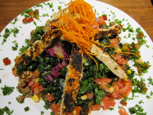 Marinated kale and red cabbage, corn salsa, quinoa, agave-roasted walnuts, ginger-papaya vinaigrette, with blackened chickin’.