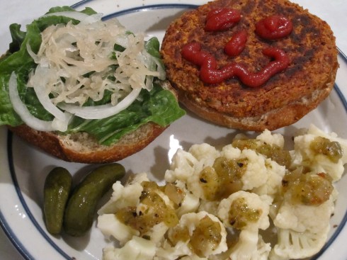 Carrot sunflower bean burger and steamed cauliflower with tomatillo salsa.