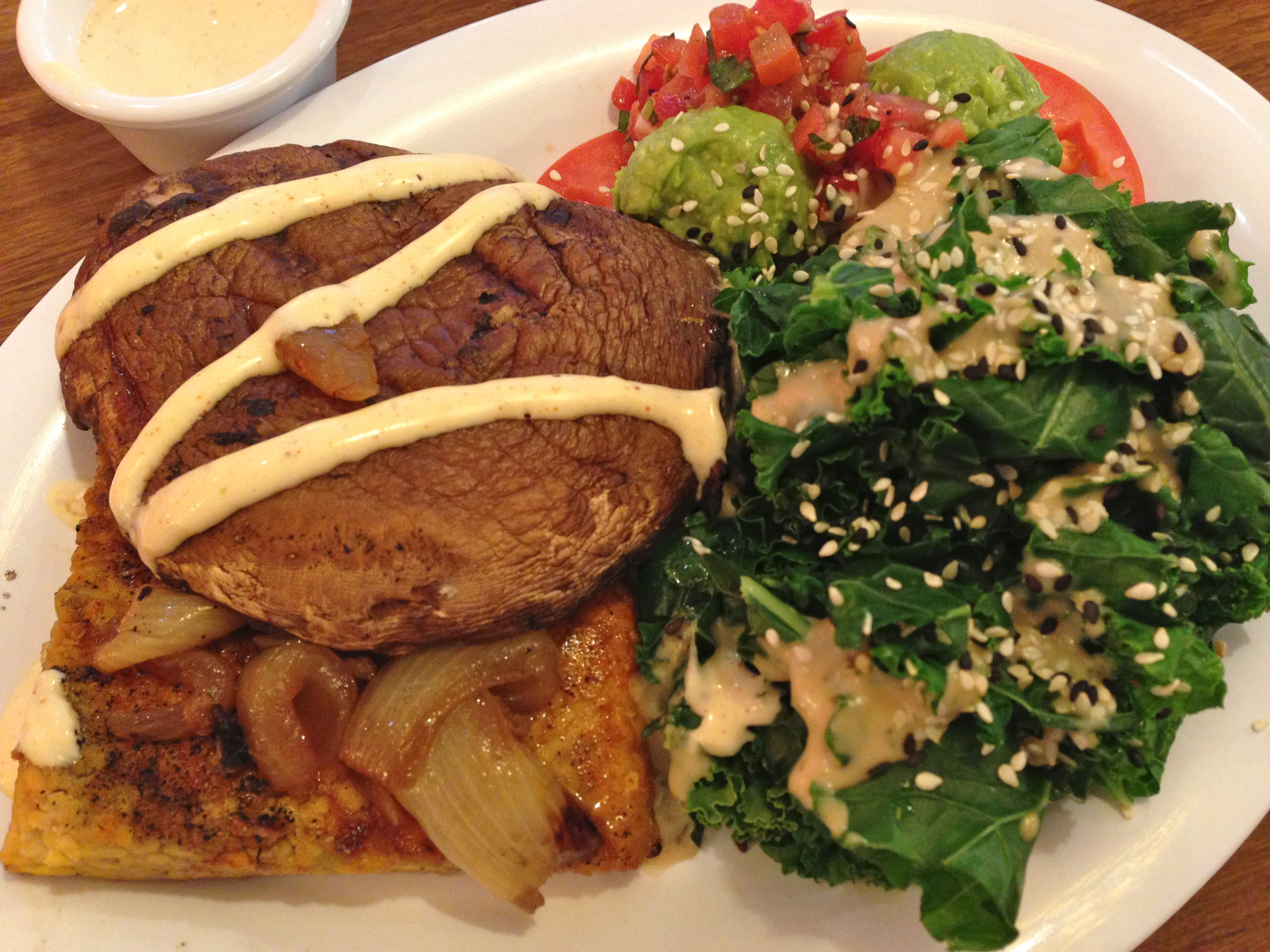 Blackened tempeh-portobello mushroom-caramelized onion stack, steamin’ kale, sliced tomato salad, chipotle ranch