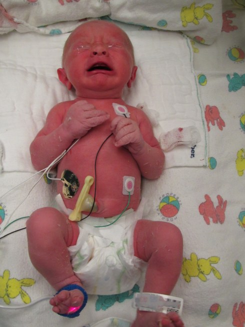 8:27 PM – Not a happy guy in the NICU. Separated from mom and poked/prodded by strangers. 😦